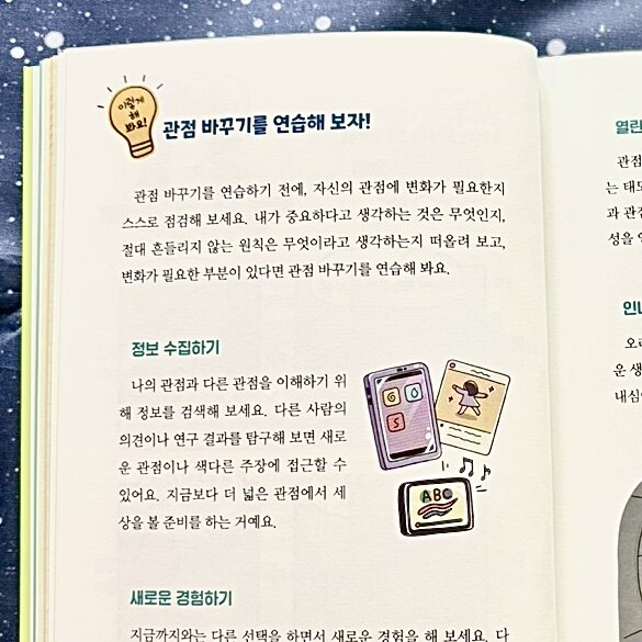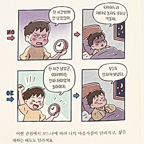 특히 마음에 들었던 부분은 만화를 통해 아이들의 흥미를 끌면서도 쇼펜하우어의 철학을 명확하게 전달한 점이다. 만화 뒤에 이어지는 ‘이렇게 해봐요’ 코너는 단순히 정답을 제시하는 것이 아니라, 아이가 직접 생각하고 적용해볼 수 있도록 구성되어 있다. 생각의 과정을 차근차근 알려주며, 같은 상황에서도 어떻게 하면 긍정적인 마인드를 가질 수 있는지를 알려주는 내용은 예민하고 불안한 우리 집 둘째와 꼭 함께 읽고 싶은 부분이었다.