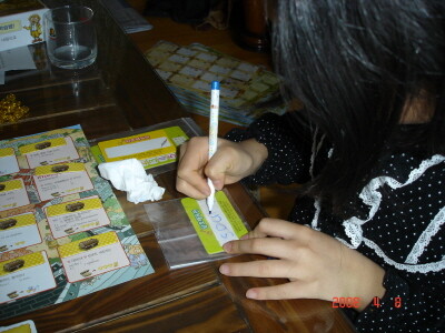 보석주사위의 색에 해당하는 칸 수만큼 이동해서 나오는 단어를 암호해독판에 적으면 성공이다. 틀리면 다른 사람이 도전할 수 있다. 하기 싫다더니 금새 게임에 빠져들어 열중하고 있는 모습. 아직까진 아는 단어가 나와선지 자신있게 적는다.