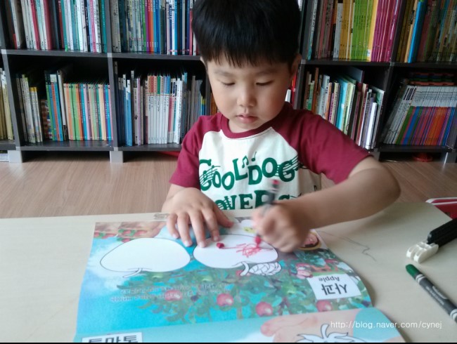 색칠을 하기 전에 사과에 관한 자연관찰을 읽어주었어요...^^