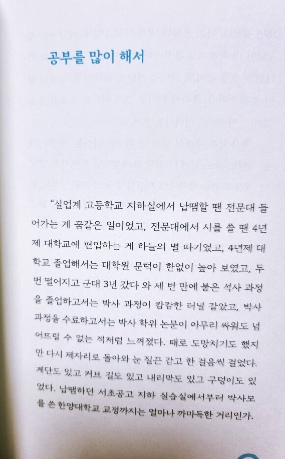 실업계 고등학교 지하실에서 납땜할 땐 전문대를 들어가는 것이 꿈이었고, 전문대에서 시를 쓸 땐 4년제 대학교에 편입하는 게 하늘의 별따기였고, 4년제 대학교를 졸업해서는 대학원 문턱이 한없이 높아 보였고,