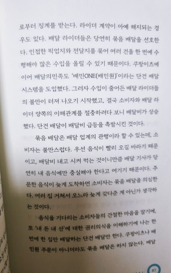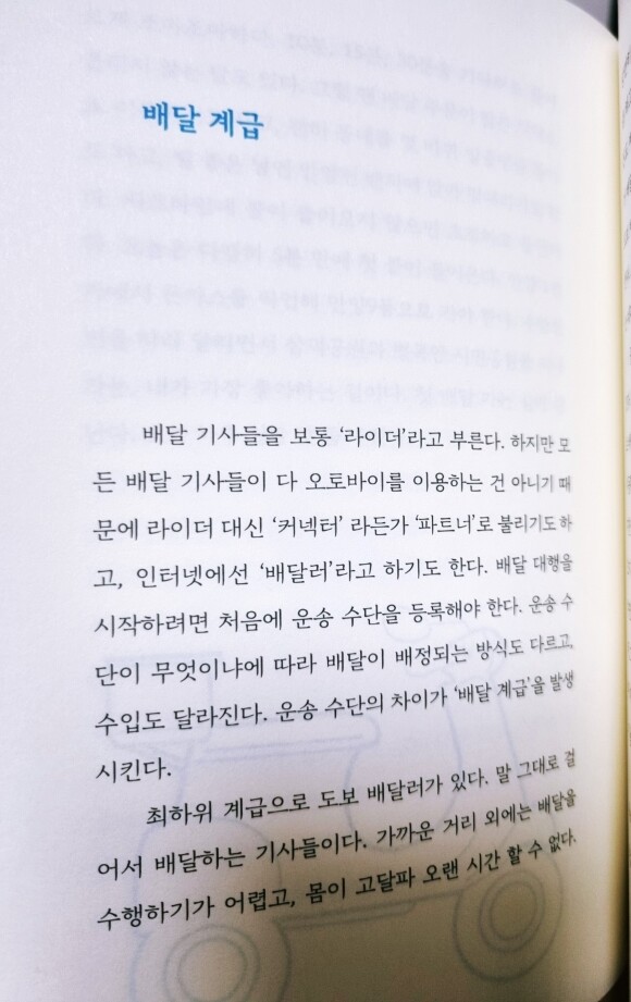 배달 일을 해보지 않았지만, 책을 통해 어느 정도 배달에 대해서 알게 되었다. 다른 음식점들에 비해 프랜차이즈를 꺼려한다는 점이나 딸배, 딸배충이라는 배달하시는 분들을 낮게 부르는 은어가 있다는 것 등