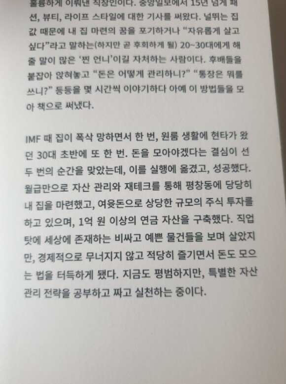 월급만으로 자산 관리와 재테크를 통해 평창동에 당당히 내 집을 마련했고 여윳돈으로 상당한 규모의 주식 투자를 하고 있다고 한다. 경험자의 말이기에 더 귀담아듣고 책에 내용을 보게 되었다.