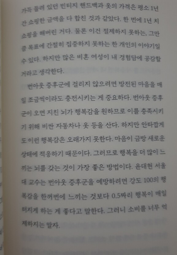 번아웃 증후군을 예방하려면 강도 100의 행복감을 한꺼번에 느끼는 것보다 0.5짜리 행복이 매일 터지게 하는 게 좋다고 말한다. 그러니 소비를 너무 억제하지는 말자