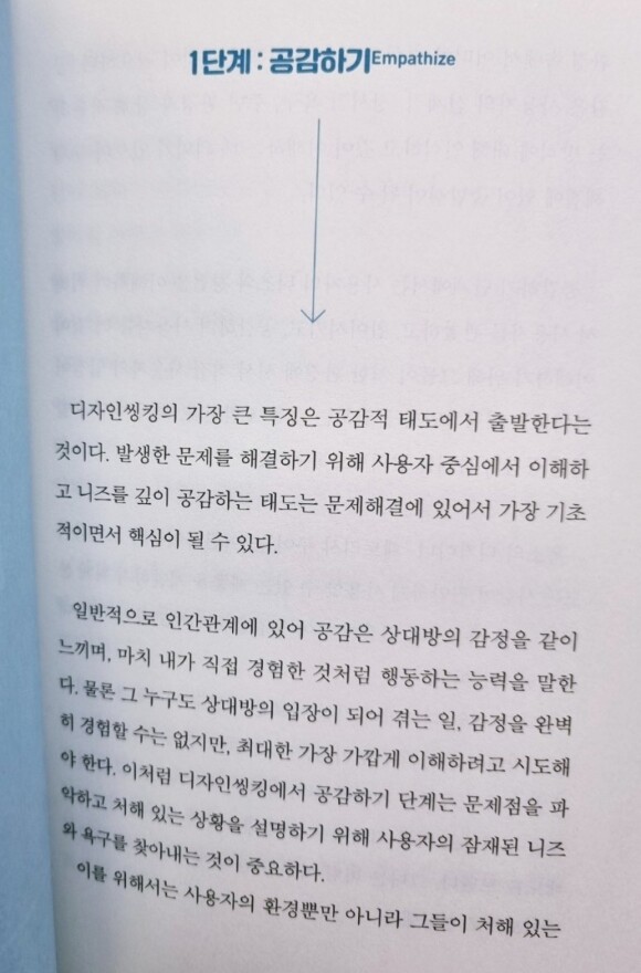 디자인씽킹의 가장 큰 특징은 공감적 태도에서 출발한다. 문제 해결을 위해 사용자 중심에서 이해하고 니즈를 깊게 공감하는 태도가 가장 기초적이면서 핵심이 되는 것이다.