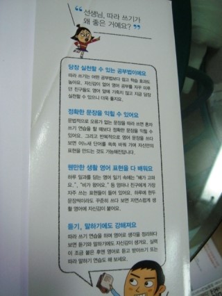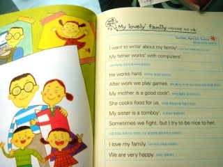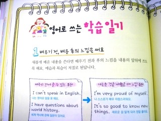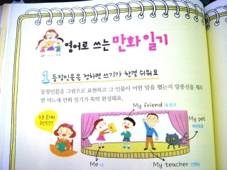 이 책은 어떤 아이라도 한번 손에 잡고 책장을 넘기기만 하면 재미를 붙일수 있을 것 같다. 캐릭터가 그려져 있는 그림도 재미나고, 영어일기라고 쓰여져 있는 예문을 들여다봐도 결코 어려운 단어가 나온다거나, 바로 읽기 힘든 문장이 나오는 것이 아니기에. 이정도는 나도 하겠다~!라는 자신감을 갖고 도전해볼수 있는 책이다.