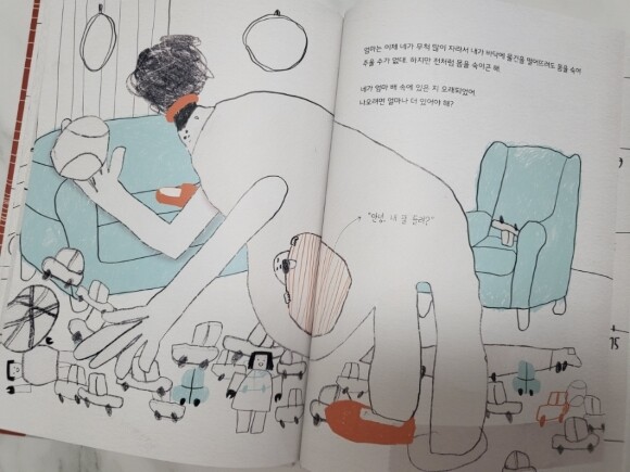 엄마는 이제 네가 무척 많이 자라서 바닥에 있는 물건을 주울 수가 없대.