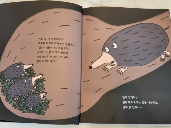 엄마 두더지가 두두, 더더, 지지에게 단단히 이른 것 처럼 바깥세상은 너무너무 위험하기에 엄청 걱정 될 것 같다 ㅠ.ㅠ