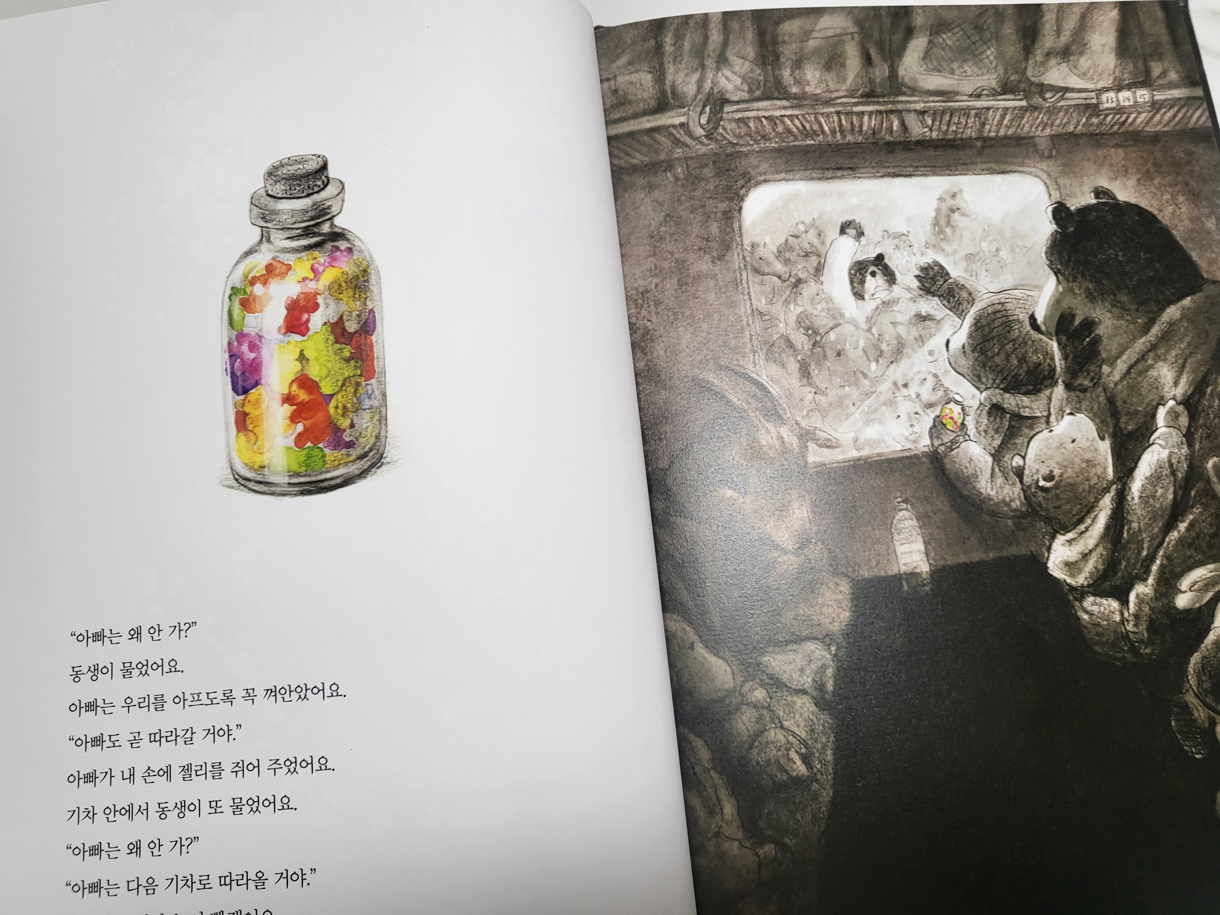 “아빠는 왜 안 가?” 동생이 묻자 “아빠는 다음 기차로 따라올 거야.” 하고 대답하며 엄마는 눈시울을 붉힌다.