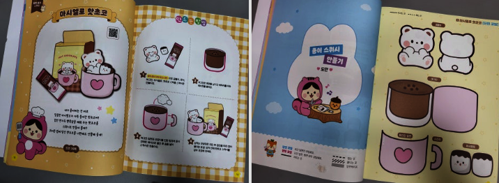 한쪽은 공부와 색칠/미로 찾기 등 재미난 활동, 한쪽은 스티커를 붙이며 다시 한 번 복습 할 수 있는 장으로 구성되어 있다.