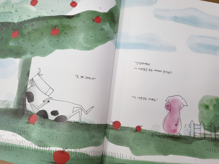 아기 돼지가 다가와서 소 아저씨에게 사과 나무로 부자가 될 수 있는 방법을 늘어놓는다.