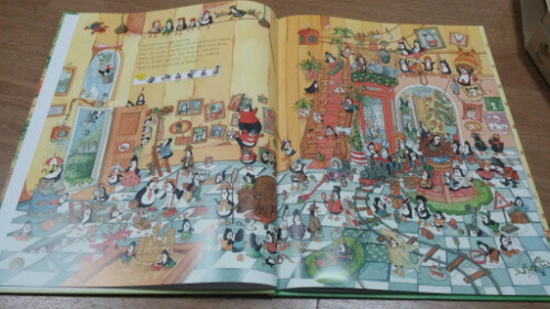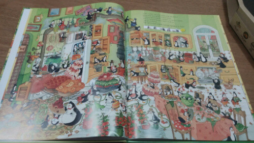 책이 펼쳐진 페이지마다 찾아야 하는 펭귄들이 있습니다.