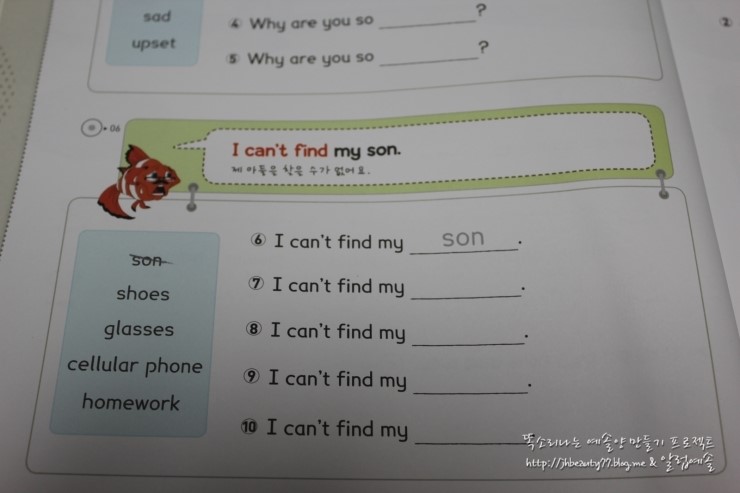 앞부분에서 배웠던 단어를 활용하면 되고 옆에 보기가 있어서 보면서 써도 된답니다