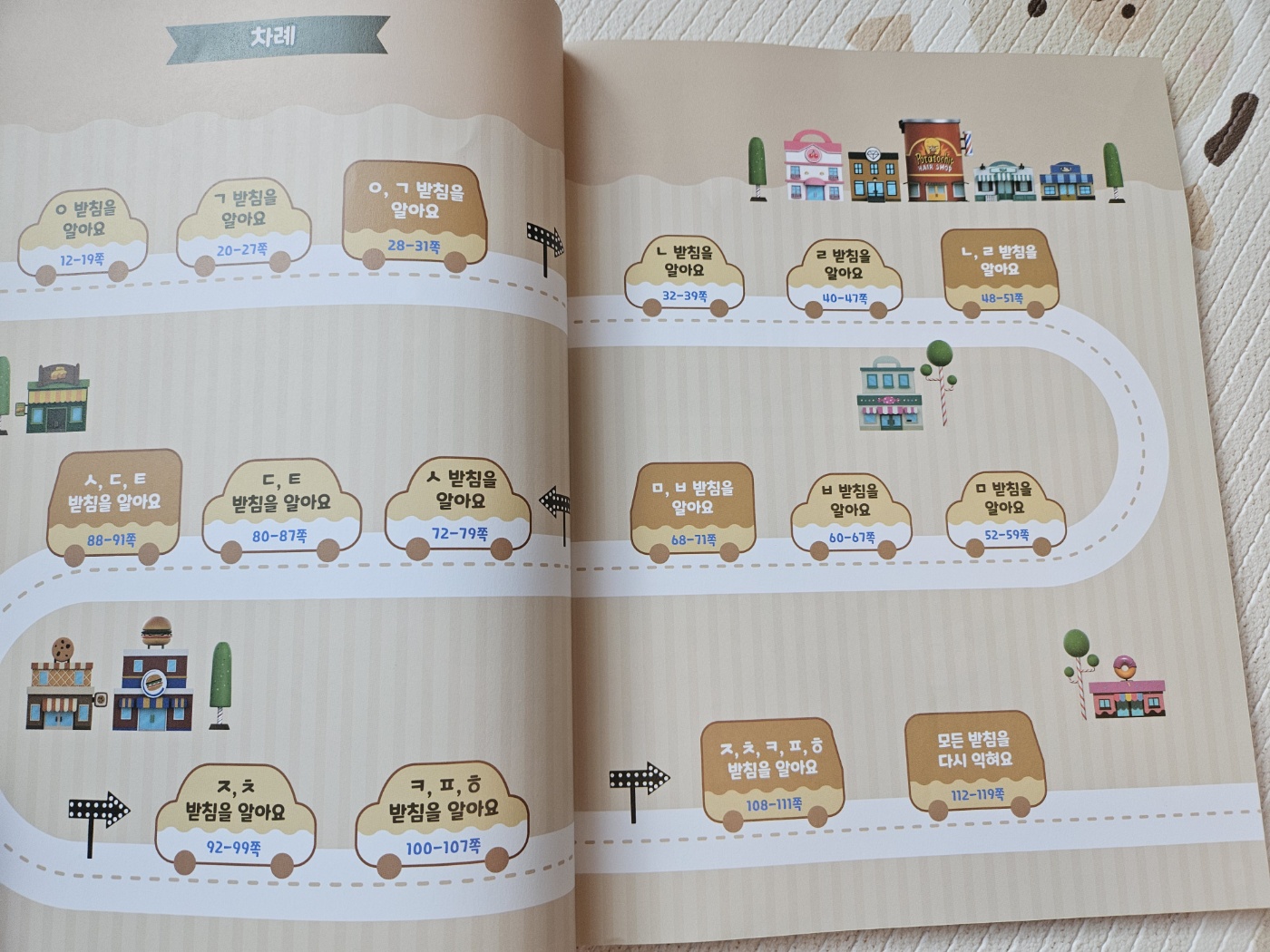 업체로부터 제품을 제공받아 작성된 후기입니다. 브레드이발소 한글 빵빵 3 상상오름 학습연구회 글상상오름초등학교 입학을 앞둔 아이들이다보니 한글공부에박차를 기하고 있요.아직까지도 한글을 잘 읽지 못하는 아이들인데요.특히나 받침있는 글자를 더욱 어려워 하다보니 아이들이 평상시에즐겨보는 브레드이발소 캐릭터들이 나오는 한글공부책으로브레드이발소 한글 빵빵 3 받침 / 상상오름 준비해봤어요.브레드이발소 캐릭터들이 총출동하여 아이들의눈을 즐겁게 해주고 집중력을 일단 향상시켜주는 데에는성공이에요!선긋가 기본모음, 자음, 받침, 쌍자음 , 복잡한모음으로 구성되어 있는데그중에서 저는 받침글자 3권을 준비해봤어요.칭찬스티커도 있다보니 아이들이 재미나게 한글공부를인식하는 데에도 도움이 되겠더라구요.모음과 자음이 만나서 한글글자가 만들어지는 기본적인원리를 이해하는 데 도움이 되고 계속해서 연습을해 나가면서 아이들이 읽어보고 쓰기까지 연습할 수 있는한글공부책이더라구요. 받침글자가 쓰인 동전을 찾아서 동그라미하는 것과받침글자를 붙여서 받침글자를 따라 쓰고 소리내어읽는 것 까지 아이들이 공부하는데 도움이 되고 있어요.실제로 저희 아이들도 시을시을 실실실 이라고읽으면서 공부를 해왔다보니 브레드이발소 한글 빵빵 3 받침 / 상상오름 도서에서도같은 구성으로 한글을 알려줘서 많이 헷갈리지 않고아이들이 단번에 이해하기 쉽더라구요!브레드이발소 한글 빵빵 3 받침 / 상상오름 도서와 함께라면재미나게 스스로 한글공부할 수 있답니다!