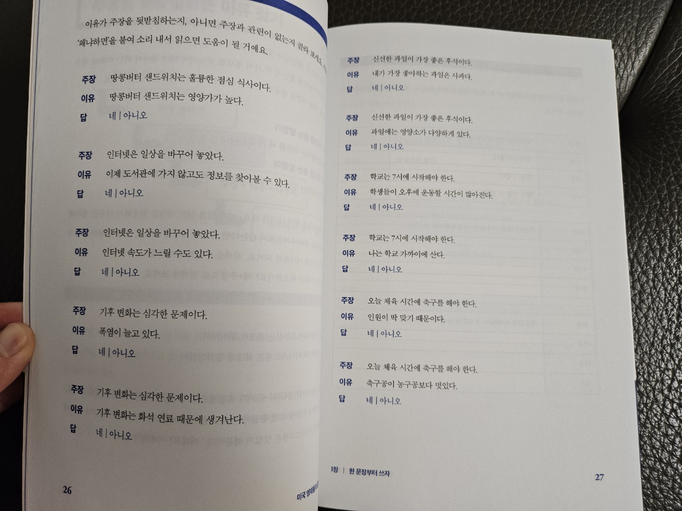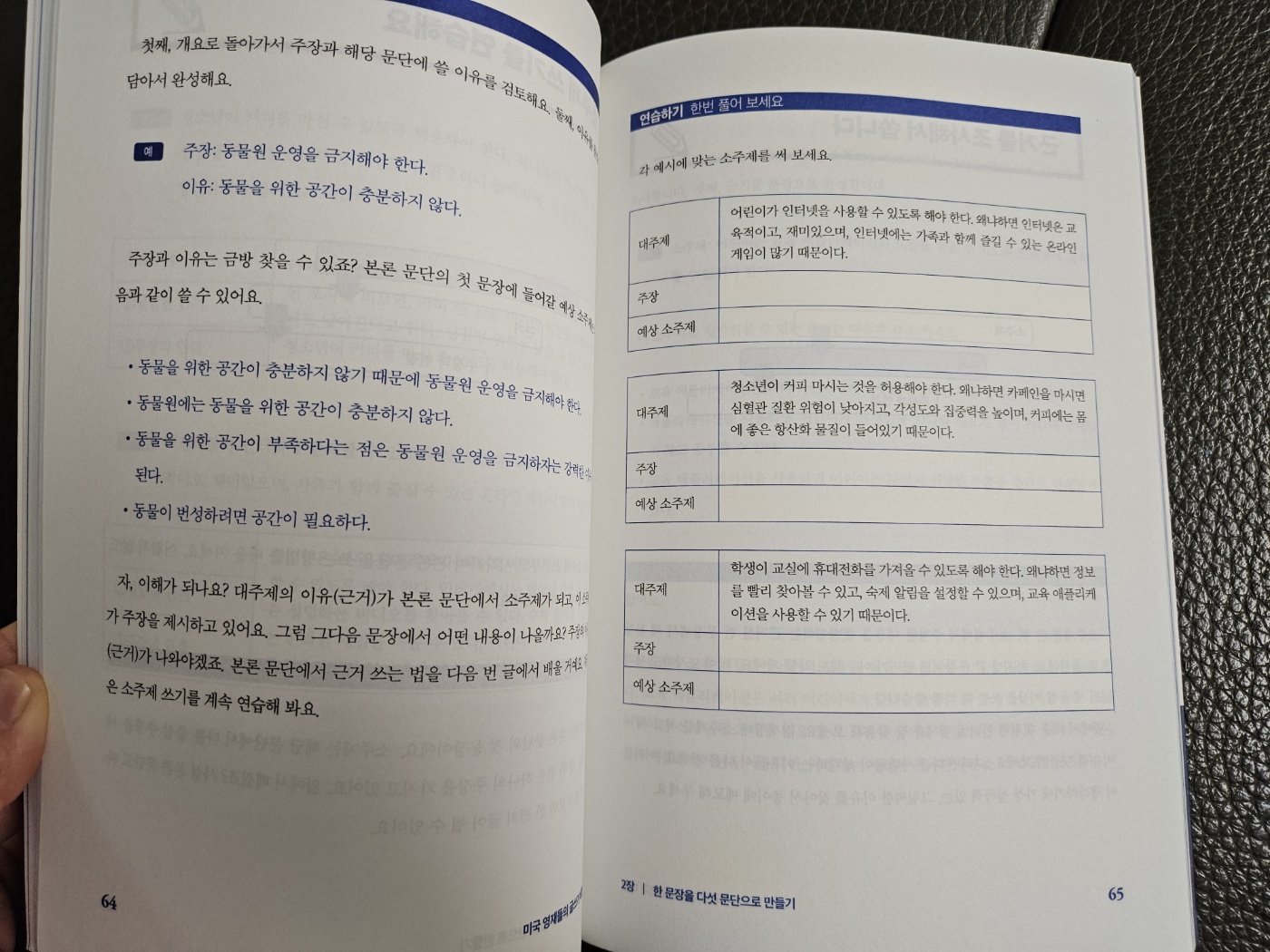 업체로부터 제품을 제공받아 작성된 후기입니다. 미국 영재들의 글쓰기 비법제이 매튜스 저/장민주 역 유노라이프글쓰기에는 어떤 논리가 숨어있을까? 글을 잘 쓰고 쉽게 쓰기 위해서는어떠한 노력들이 뒷받침 되어야할지에 대한 방법들을쉽게 미국 영재들의 글쓰기 비법 / 유노라이프 도서를 통해서알 수 있었는데요. 챕터를 나누어 다섯문단을 논리적으로 쓰는 방법에 대해서배울 수 있었습니다.아이들도 책에서 글을 자주 접하다보니 글을 자주 보고글을 써보고 싶다고 하는 경우도 있다보니 어떠한 방식으로아이들에게 글쓰기를 효과적으로 알려줘야할지 막막한 경우가 있었다보니미국 영재들의 글쓰기 비법 / 유노라이프 도서를 참고하여요약과 연습을 통해서 글쓰기에 대한 연습을 할 수 있을 것 같습니다.실제 미국에서 글쓰기에 대한 주제로 가장 대중적인 부분이며, 아이들이글쓰기뿐 아니라 어떠한 주제에 대해서 논리적으로 생각할 수 있는힘을 키워줄 수 있을 것 같더라구요.1장에서는 대주제만들기 연습도 나와있는데요.실전적용으로 단계별로 따라할 수 있다보니 아이들이 미국 영재들의 글쓰기 비법 / 유노라이프도서를 읽으면서 자연스럽게 연습과 학습이 뒷받침되는 것 같더라구요.지시문을 분석하고 주제어, 방향어를 파아가하고주제어를 주장으로 바꾸어 이유를 찾고 마지막으로 주장과이유를 대주제로 바꾸는 연습을 풀어보고 있다보니 저희 아이들에게도어린이가 인터넷이나 핸드폰을 사용할 수 있도록 허용해야 하는가에 대해서같이 이야기를 나누어볼 수 있게 되더라구요.2장에서의 한문장을 다섯문단으로 만드는 과정에서도근거를 주장과 연결하는 부분이 가장 어렵게 느껴지더라구요.충분한 근거가 뒷받침 되어야지 주장을 강화할 수 있는데요.글의 주장을 확인하고 해당 본론에서 근거와 주장을 이어주는 연습을 통해서글쓰는 요령을 한단계 익힐 수 있는 시간이었답니다. 도서 말미에는 연습문제에 대한 해답도 수록이 되어 있는데요.꼭 여기에 명시되어 있는 부분만이 해답은 아니며 지시문, 주제어, 방향어를잘 설정하여 글쓰는데 도움이 많이 되고 있답니다.