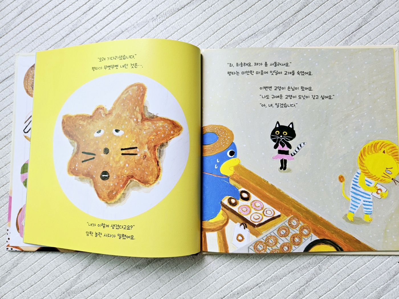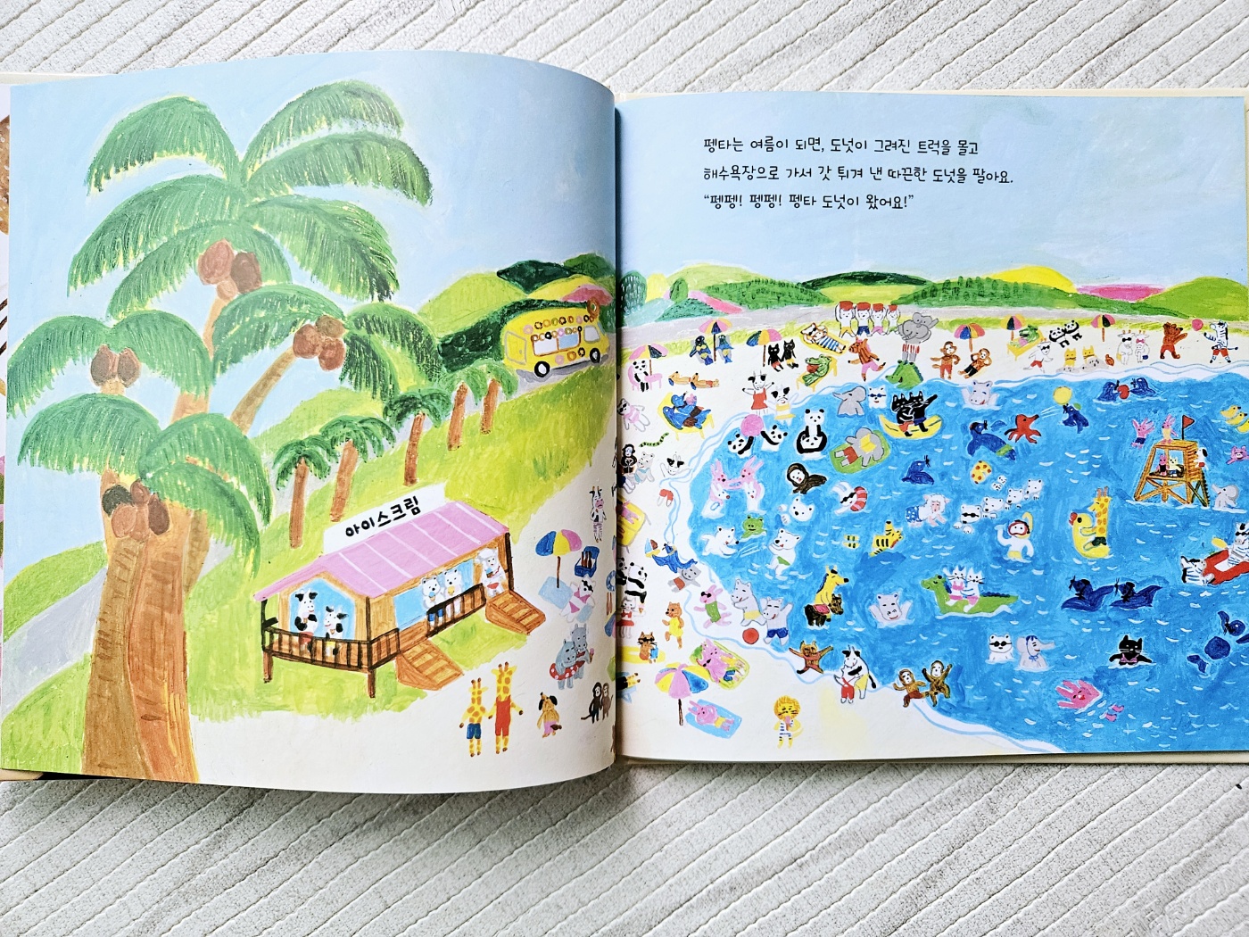 도넛 펭타시바타 게이코 글그림/황진희 역 길벗어린이일본 300만부 판매를 기록한 베스트셀러 빵도둑 시바타케이코작가의 신간으로 올여름 아이들과 재미난 책육아를할 수 있게 기대되는데요!빵도둑시리즈를 아이들도 즐겨읽었다보니 이번 도넛 펭타 / 길벗어린이도서의 주인공인 펭타의 어떤 매력이 펼쳐질지까지 기대가 되더라구요.펭귄펭타는 여름철이 되면 바닷가에서 갓 튀긴 도넛을 팝니다.코끼리 손님은 펭귄 펭타의 머리에 있는 도넛에 관심을 보입니다.하지만 펭타가 쓰고있던 것은 일반적인 모자가 아닙니다.바로 도넛튜브였습니다!물에 빠진 돼지를 아주 유연하게 구해내면서 펭타의 정체가모두에게 공개됩니다. 아이들은 이 부분에서 꺄르르 웃었어요.작가만의 기발한 상상력으로 아이들에게 재미를 선사합니다.저희 아이들도 도넛 펭타 / 길벗어린이 도서를 읽으면서토끼모양의 도넛을 만들어서 먹어보고 싶다고 하더라구요.오늘 하원후에 아이들의 간식은 아마도... 도넛이 되겠어요^^도넛 펭타 / 길벗어린이 에 나오는 다양한 동물주인공들을통해 아이들도 각각 캐릭터의 감정들을 간접적으로 느낄 수 있고또 다른 해수욕장에 가서는 어떤 내용들이 펼쳐질이 아이들과마지막까지도 즐거운 상상을 하면서 읽게 되는 도서였습니다.올 여름 아이들과 해수욕장으로 휴가계획을 가지고 있다보니펭타를 만나볼 수 있을지 손꼽아 기다려진다고 합니다^^업체로부터 제품을 제공받아 작성된 후기입니다.