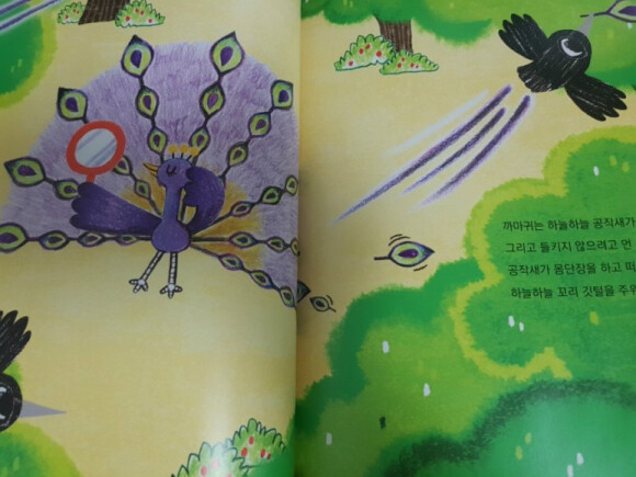 꼬리 깃털을 주워서 꼬리에 붙이고, 꾀꼬리의 노랑노랑 깃털, 앵무새의 알록달록 깃털? 등 새들의 깃털을