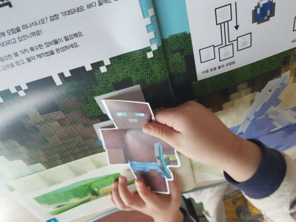 아이들이 [마인크래프트 바다의 모험 스티커북]책에 집중할 수