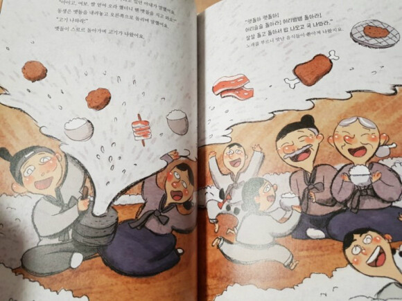 맷돌에서는 맛난 음식들이 쏟아져 나오고, 쌀이든 돈이든 쏟아져 나오니 동생은