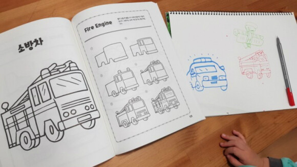 아이는 책을 한 장씩 넘겨가며 좋아하는 탈 것 그림을 엄마에게 그려달라고