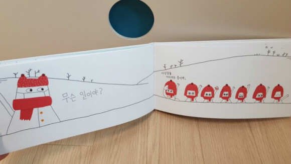작고 귀여운 사이즈의 책에 새하얀 눈 배경, 그리고 귀여운 사냥꾼들의 모습이