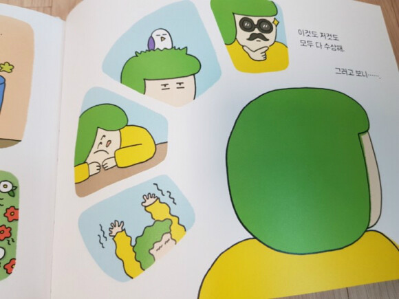 동그란 초록 머리를 하고 의심스러운 눈빛으로 여기 저기를 살피는 듯한