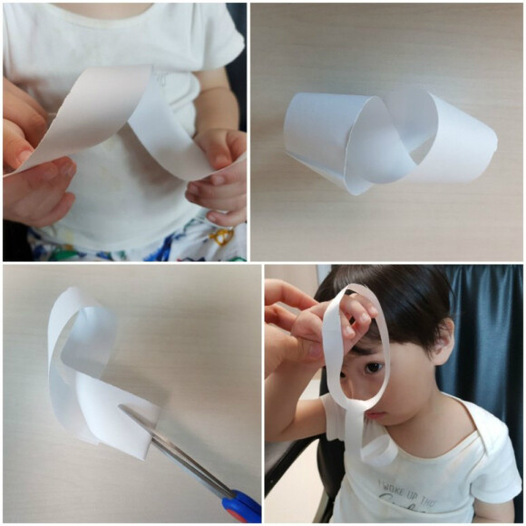 하나는 꼬지 않고 그대로, 두 번째 종이는 한 쪽 끝을 한 번 뒤집어서,