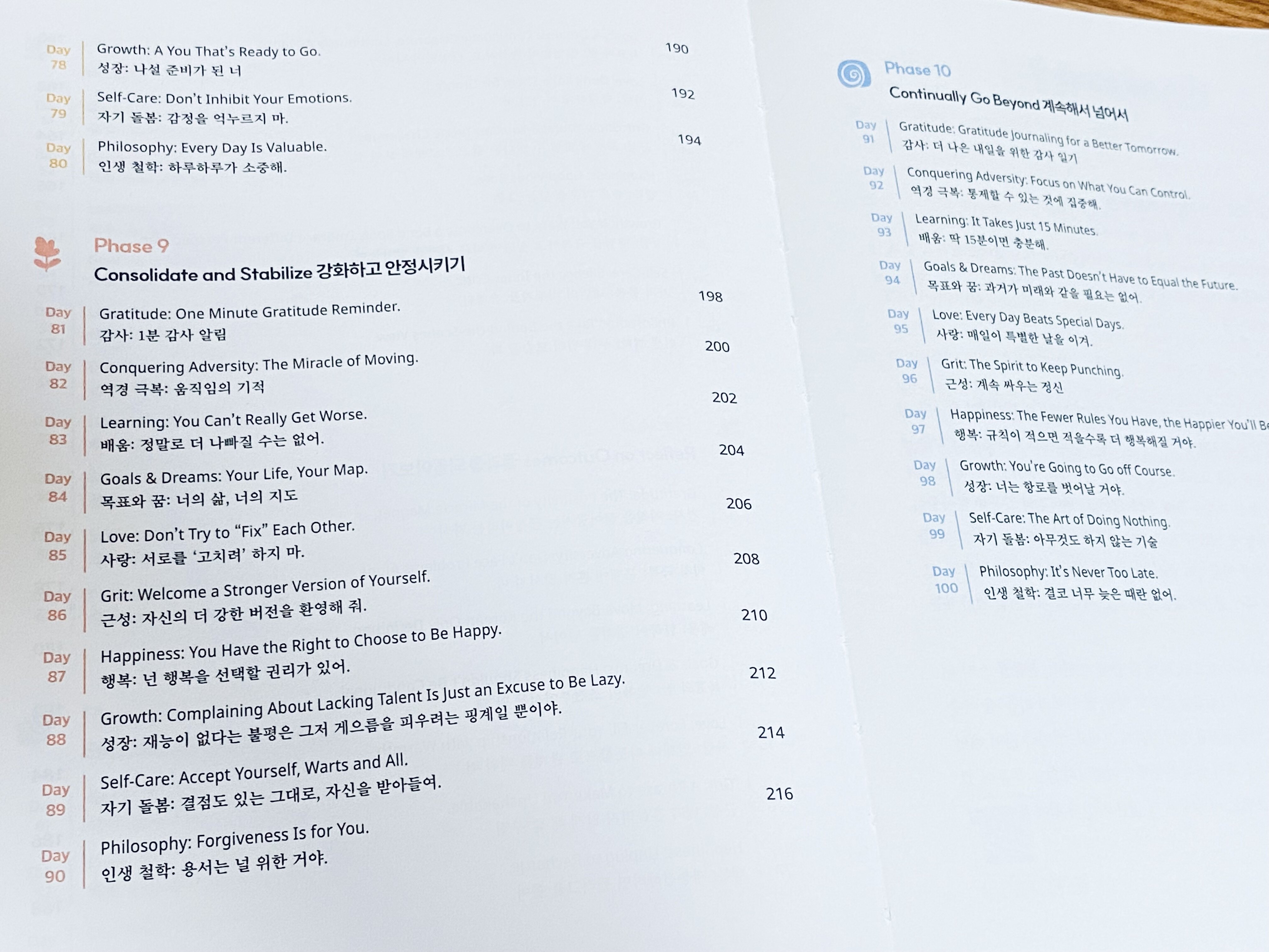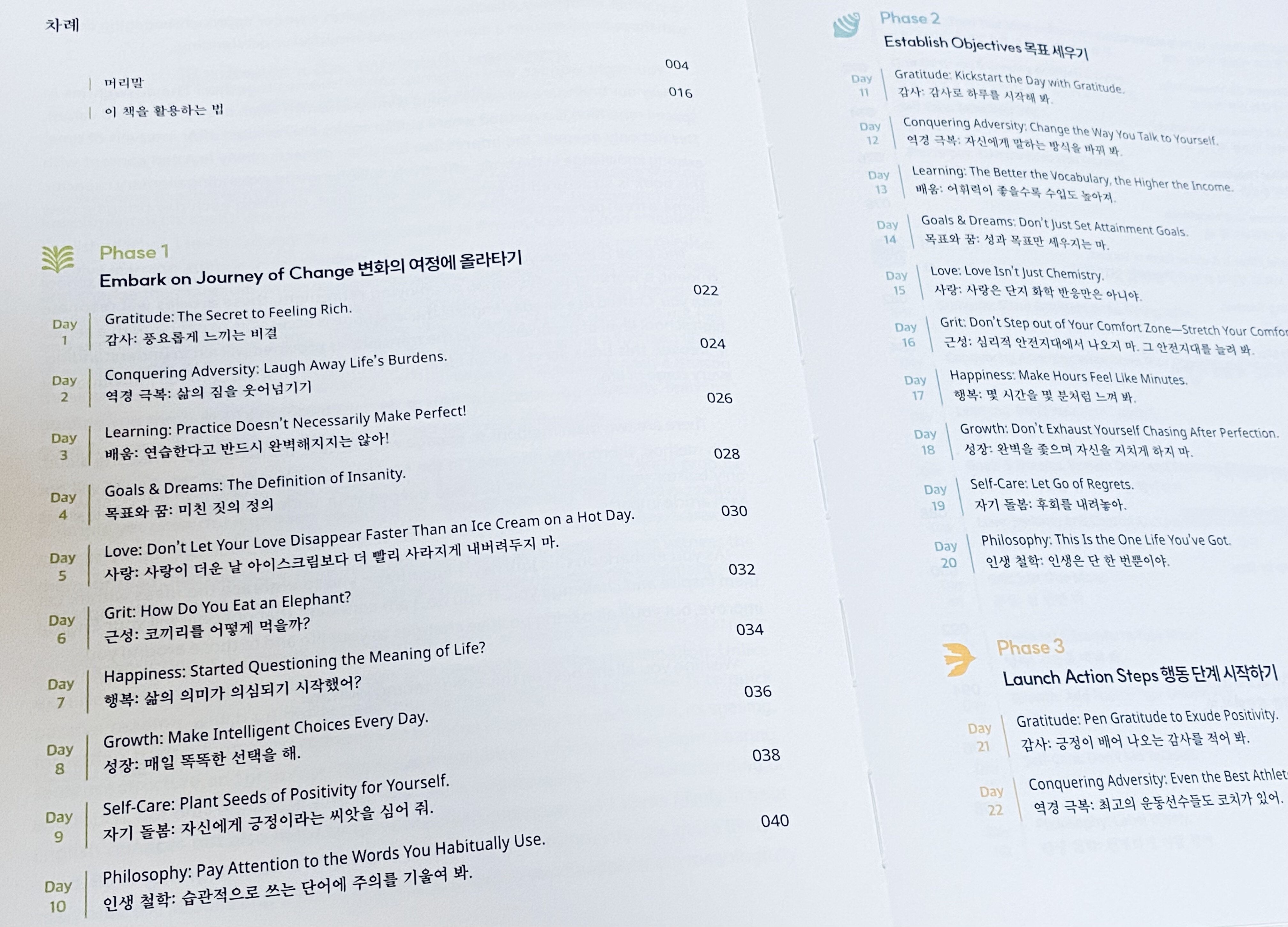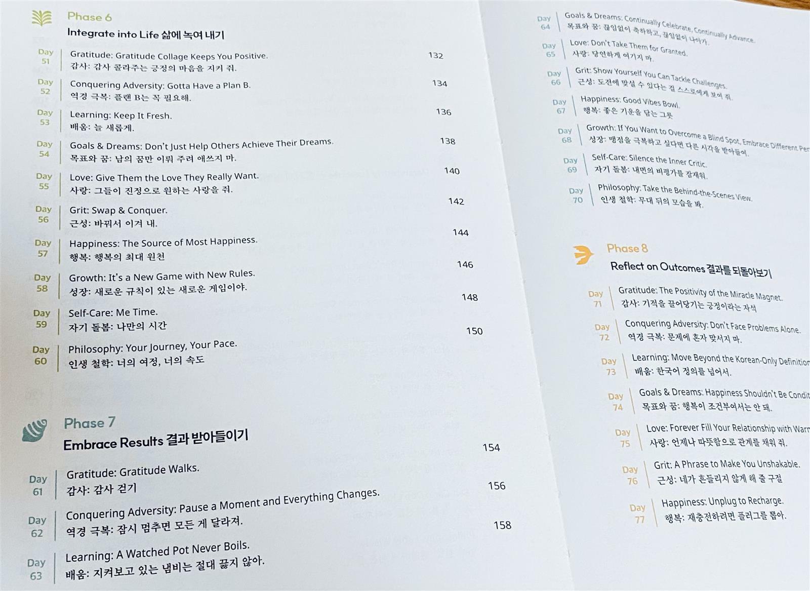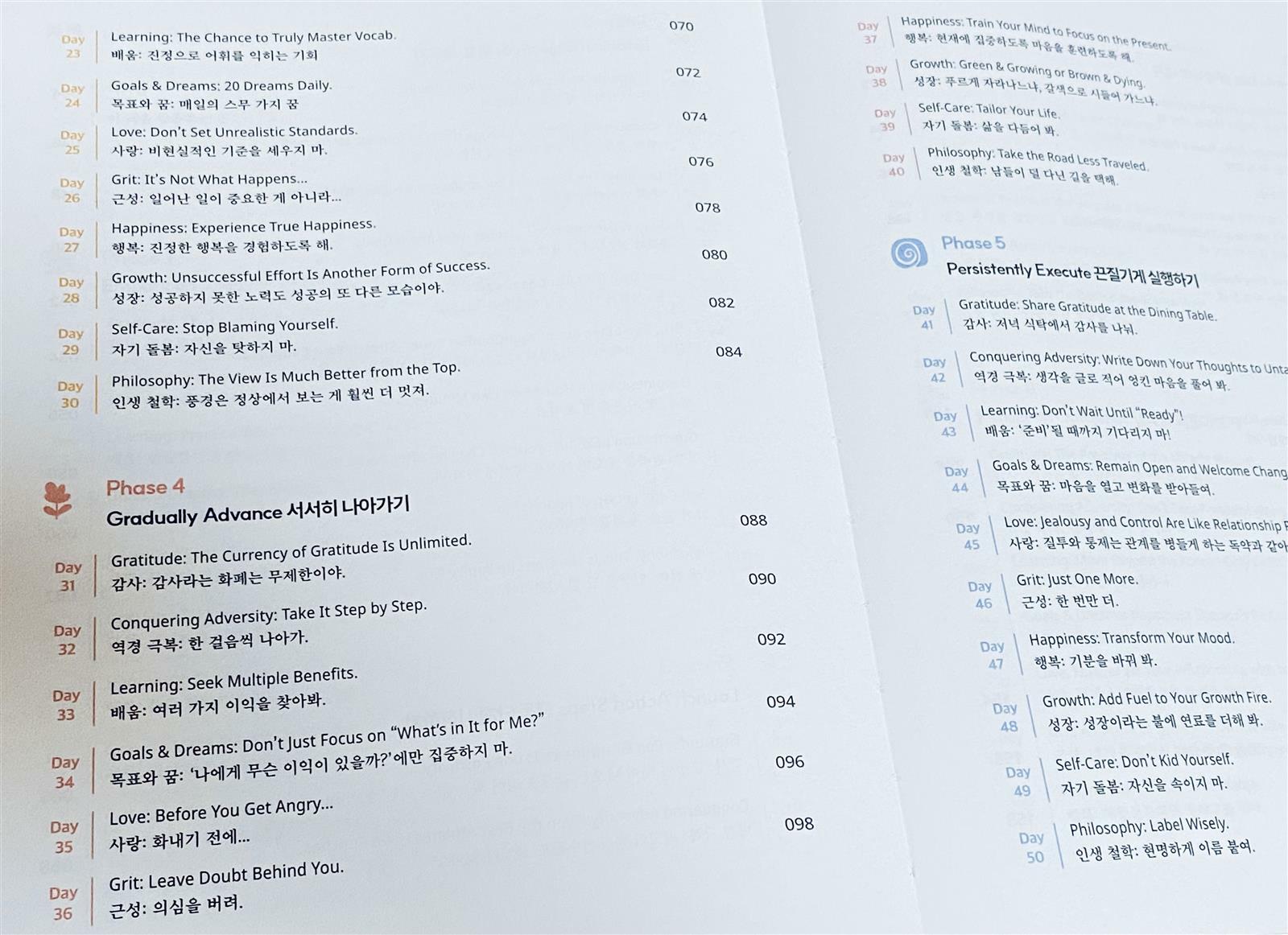 이 책은 ‘변화의 여정 올라타기, 목표세우기, 행동 단계 시작하기, 서서히 나아가기, 끈질기게 실행하기, 삶에 녹여내기, 결과받아 들이기, 결과를 되돌아보기, 강화하고 안정시키기, 계속해서 넘어서’라는 10개의 파트로 나누어져 있으며 ‘감사, 역경극복, 배움, 목표와 꿈, 사랑, 근성, 행복, 성장, 자기돌봄, 인생철학’이라는 10가지 핵심 주제로한 영어 문장들이 있다.