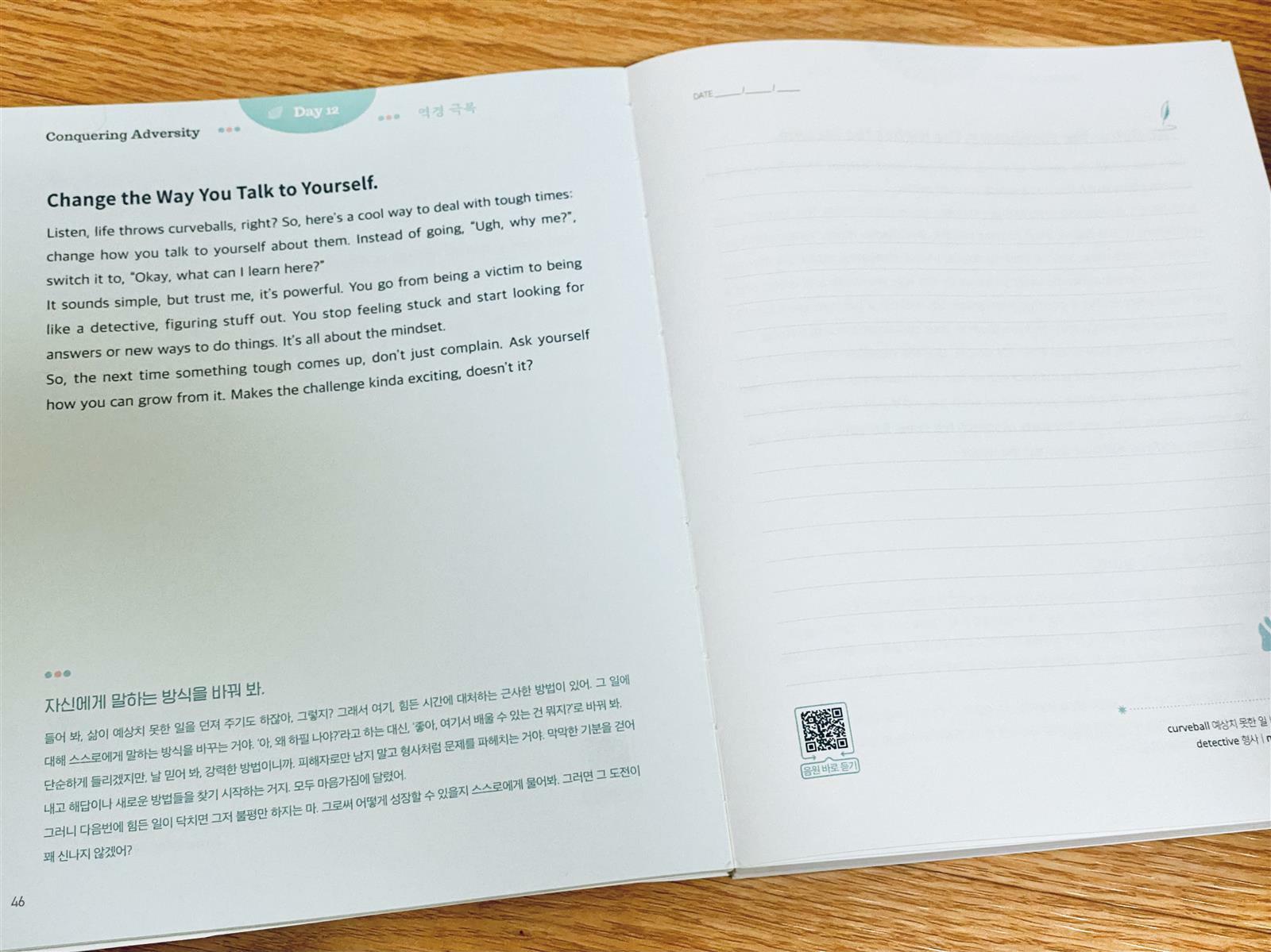 왼쪽에 영어문장과 한글 해설이 있도 오른쪽엔 필사할 수있는 노트 여백과 영어문장을 들을 수 있는 음성 QR코드와 주요 핵심 단어와 뜻이 적혀 있다.