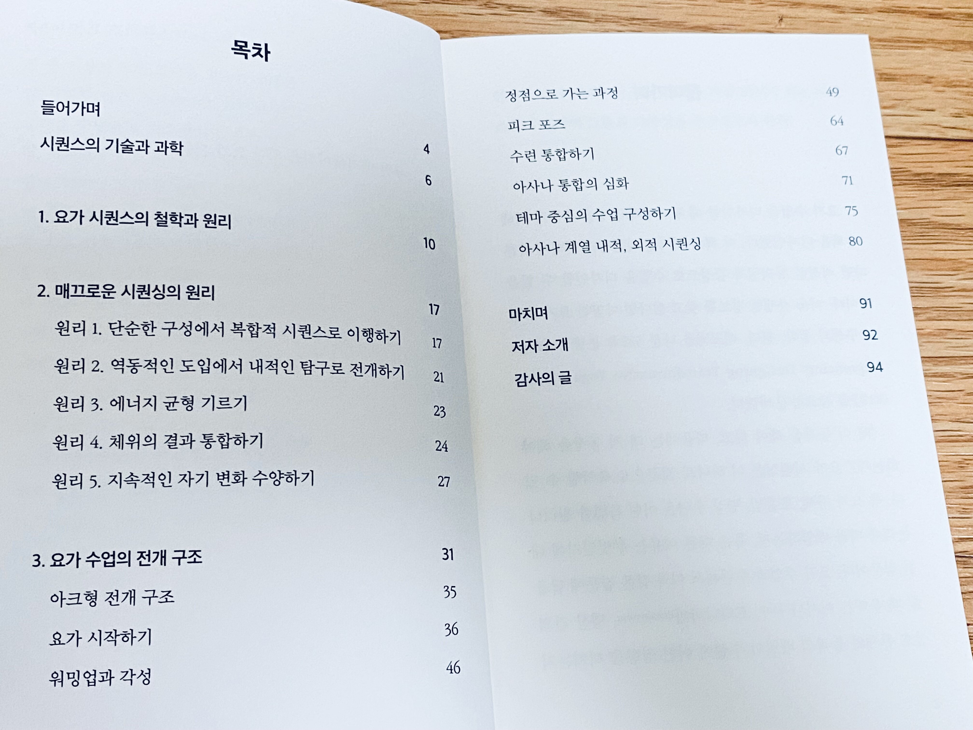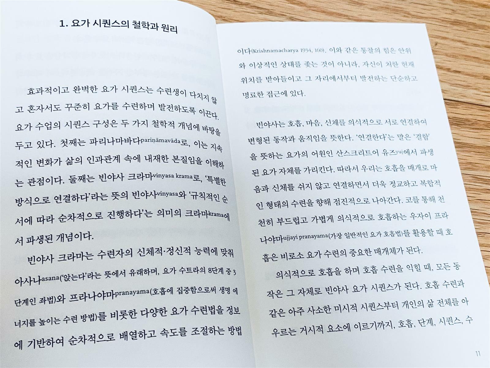 책은 요가 시퀀스의 철학과 원리 등 이론적인 내용과 각 동작들에 대한 간단한 브리핑이 있다.