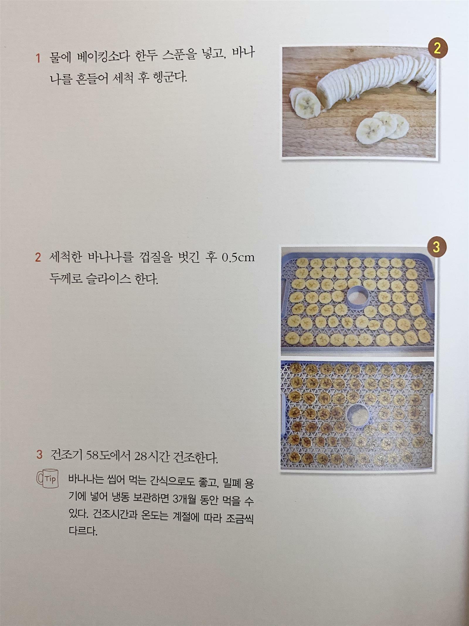 근데 바나나 건조한거는 사먹어 본적 있는데 쫄깃하니 향도 좋았고 맛있었던 기억이 난다~ 그래서 식품 건조기 살까도 생각했었는데 사도 둘데도 없고 몇 번이나 만들어 먹겠나 싶어서 안 샀었는데 책을 보니 살짝 다시 고민이 된다. ㅋㅋ
