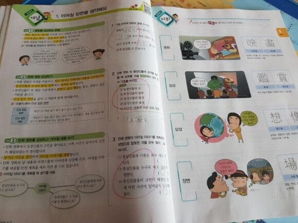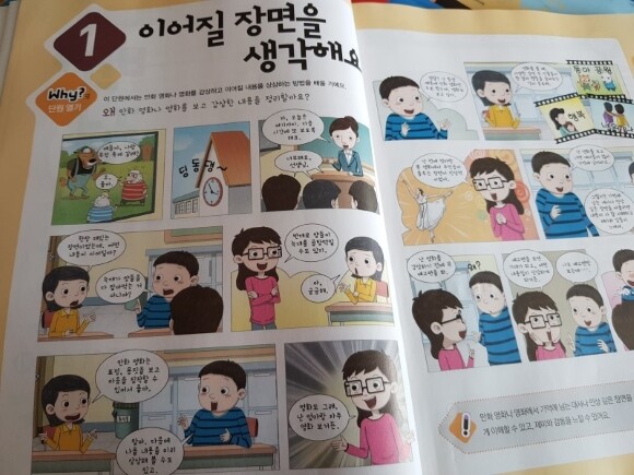 1단원에서는 만화 영화와 영화를 감상하고 이어질 내용을 상상하는 방법을