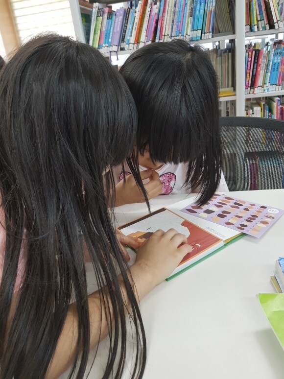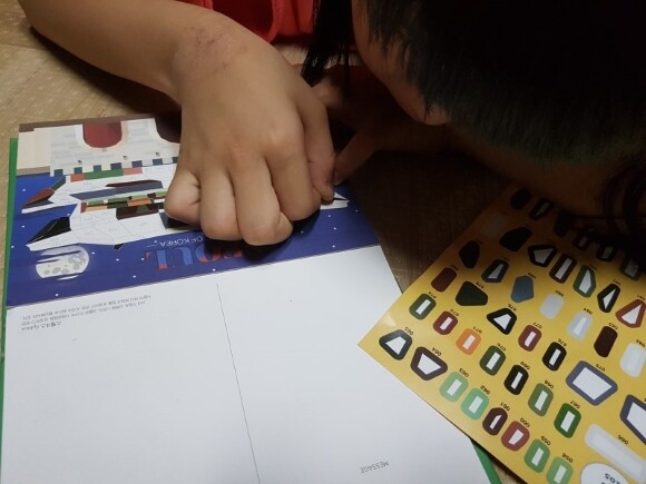 언니가 붙힌 스티커가 혹시나 떨어질까봐 둘째가 붙힌 스티커를 옆에서 꾹꾹