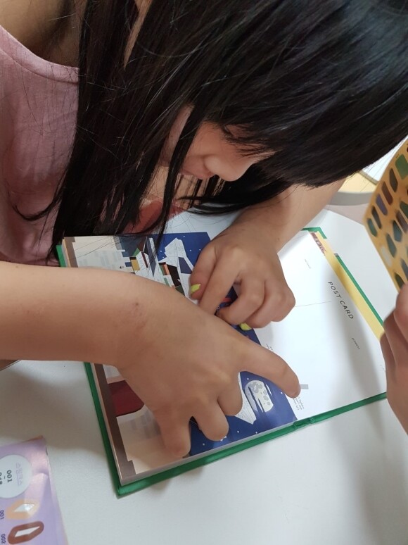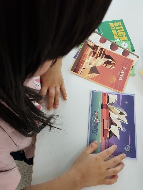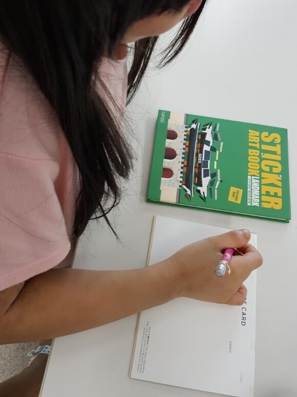 스티커 아트북인 랜드마크 엽서북으로 집중력을 키우고 있어요.