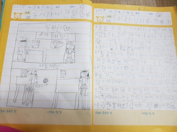 주말이라 유치원에 가지 않았던 막둥이의 일기 주제는 누나들과 도서관에서