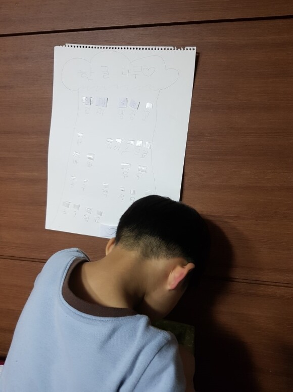바구니에 한글을 찾아 한글 나무를 완성하는 막둥이 !!