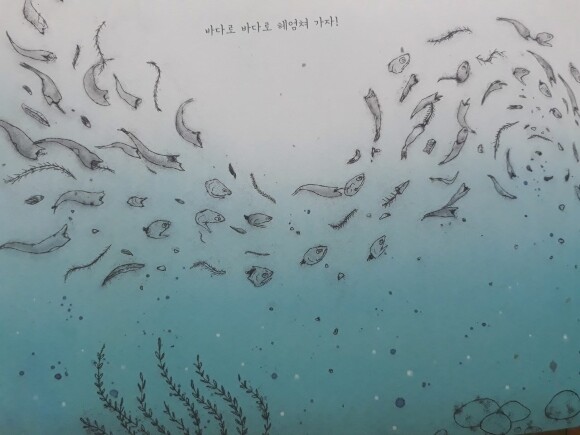 표지를 펼쳤을 때 앞 표지와 뒷표지의 멸치모습이 다르게 다가왔어요.