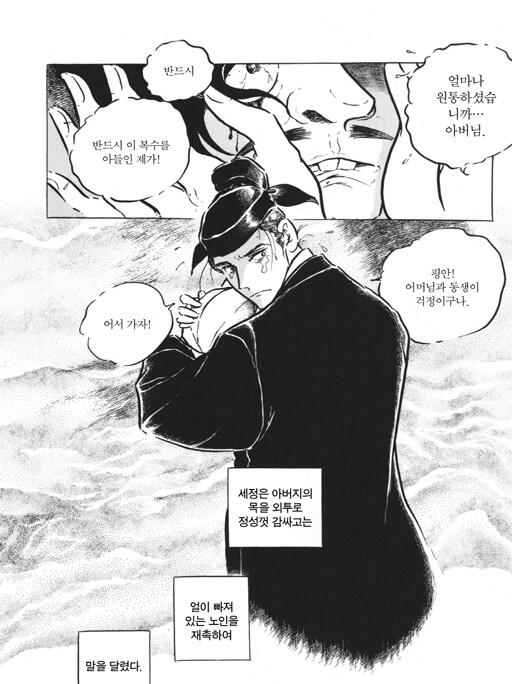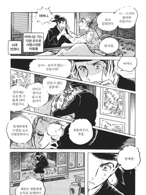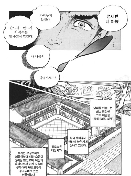 우선 작가를 알 필요가 있습니다. 와타나베 마사코란 이름은 상당히 낯설게 들려오죠. 그러나 조금 더 살펴보면 이내 익숙한 단어들을 발견할 수 있습니다. <유리의 성> 일본에서는 69년부터 70년까지 연재되었고, 국내에서는 정식발매가 아닌 해적판으로 나온 적이 있죠. 순정만화에서는 <유리가면>, <베르사이유의 장미>와 어깨를 나란히 하는 유명한 작품이며, 와타나베 마사코씨 역시 순정만화계의 거물입니다. 이런 거물이 80년대에 들어와 손을 댄 작품이 바로 이 <금병매>입니다. 학문에 매진하고 있던 주인공 왕세정에게 어느 날 찾아온 하인 초반부터 빠르게 전개되는 긴장감에 이야기의 집중도가 높아진다. 마른 하늘에 날벼락과 같은 아버지의 죽음. 타락한 정치가 엄세번 밑에서 청렴함을 지키다 누명으로 돌아가신 아버지 아버지의 죽음으로 충격을 받은 어머니는 병으로 쓰러지고, 하나 뿐인 여동생마저 엄세번에게 변고를 당해 자살한다. 아버지와 여동생의 복수를 다짐하는 왕세정. 그러나 나는 새도 떨어뜨리는 권세를 지닌 엄세번에 대한 복수의 길은 멀고 험난하기만 하다. 왕세정은 호색한 엄세번이 유독 외설적인 소설을 좋아하며, 책장을 넘길 때마다 손에 침을 묻히는 버릇이 있다는 것을 알아내고 자신이 지닌 문장실력으로 희대의 외설서를 지어내 엄세번에게 바친다. 그를 독살하기 위해서. 금병매는 단순히 외설적인 내용에 초점을 맞추어보면 그저 그런 별 볼일 없는 잡서에 불과합니다. 금병매라는 타이틀로 영화화된 많은 작품들이 바로 이런 문제로 인해 제대로 된 가치를 드러내지 못하고 있죠. 명나라라는 중국의 시대에 만연했던 부패와 사회상을 외설서의 형식으로 낱낱히 고발한 사회성을 이해해야 그 가치를 제대로 알 수 있습니다. 선이 굵은 삼국지나 수호지와는 달리 섬세하고 유려한 문장을 독특한 개성의 만화로 풀어내 자칫 지루해지기 쉬운 소설의 단점을 극복한 와타나베 마사코씨의 역량이 돋보입니다