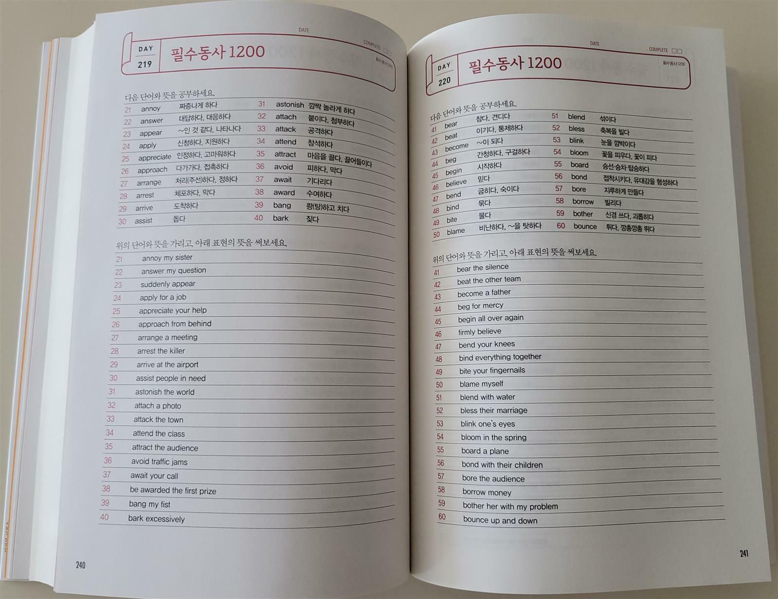 중요한 필수동사 1200개와 관련 예문으로 알차게 익혀 볼 수 있어요.