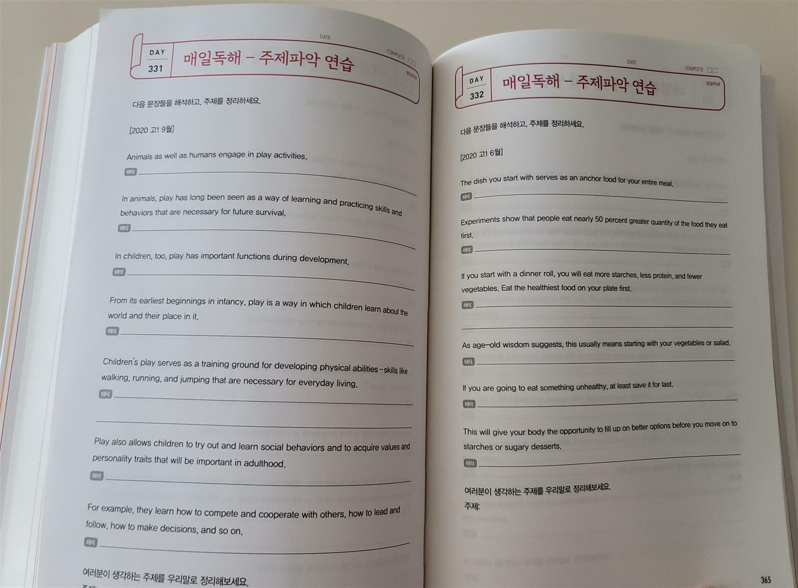 주제 찾는 연습과 수능영어의 독해 유형을 익혀 볼 수 있도록 하고 있어요.