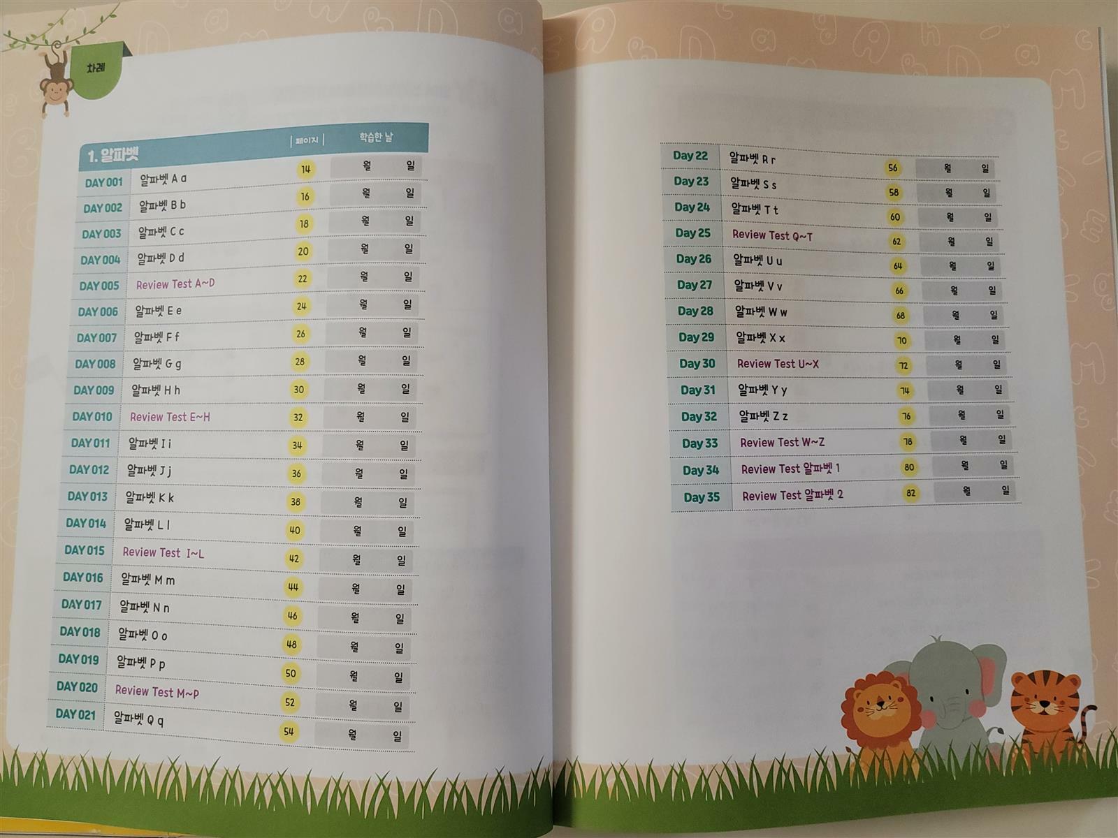 발음/단어 영상 -> 동영상 강의 -> 읽고 따라 쓰기 -> 오늘의 활동까지