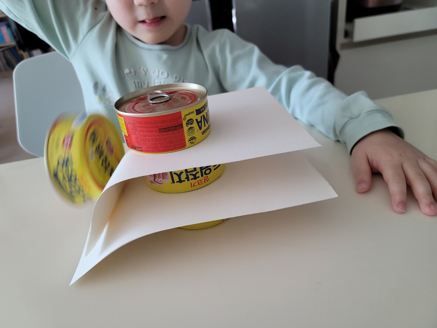 모양이 동일한 통조림을 탑을 쌓아서 종이를 빼기를 여러번