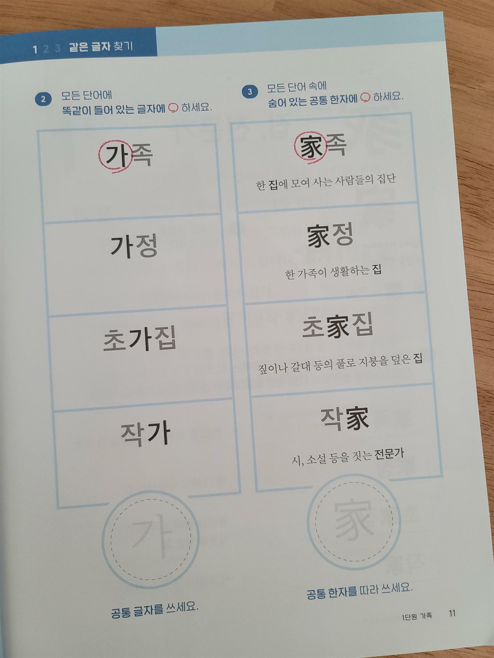 1단원 가족 단원에서는 어떤 한자에 대해서 배우는지