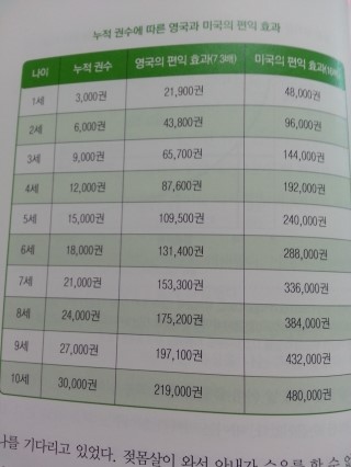 영유아 시절에 나이별로 읽은 책의 누적 권수에 따라 청소년기에 7.3배와 16배의 효과로 나타난다는 뜻이다. 어린시절 책 읽기가 아이의 인생에 어떻게 영향을 주는지 표로 확인해 볼 수 도 있다.