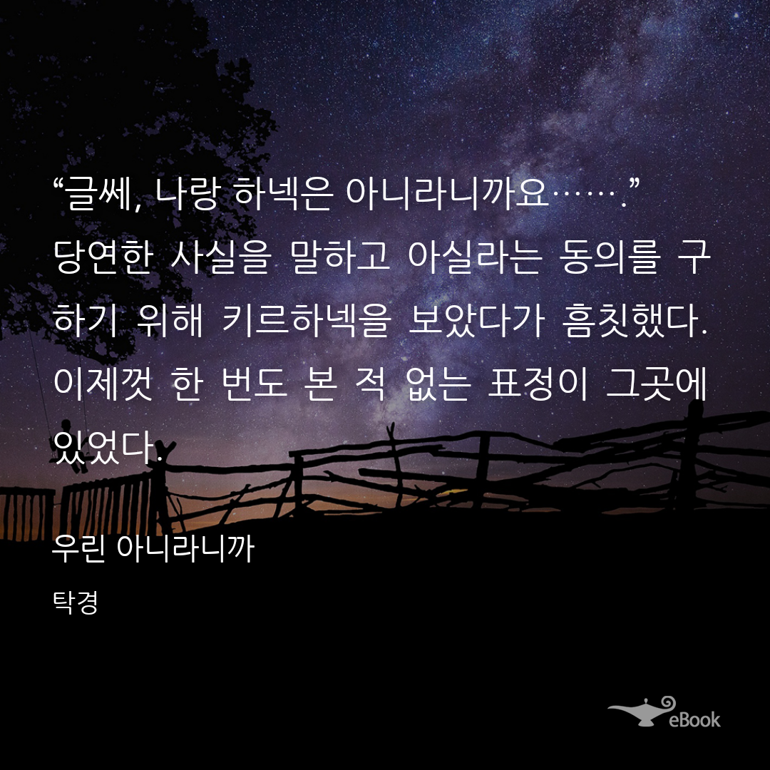 좋은 날이어선지 드물게 옅은 미소를 만면에 드리운 데다 말투도 그 과묵하던 키르하넥이 맞나 싶을 정도로 부드러웠다. 아실라는 어쩐지 낯이 간지러워지는 걸 느끼며 빠르게 말을 주워섬겼다.