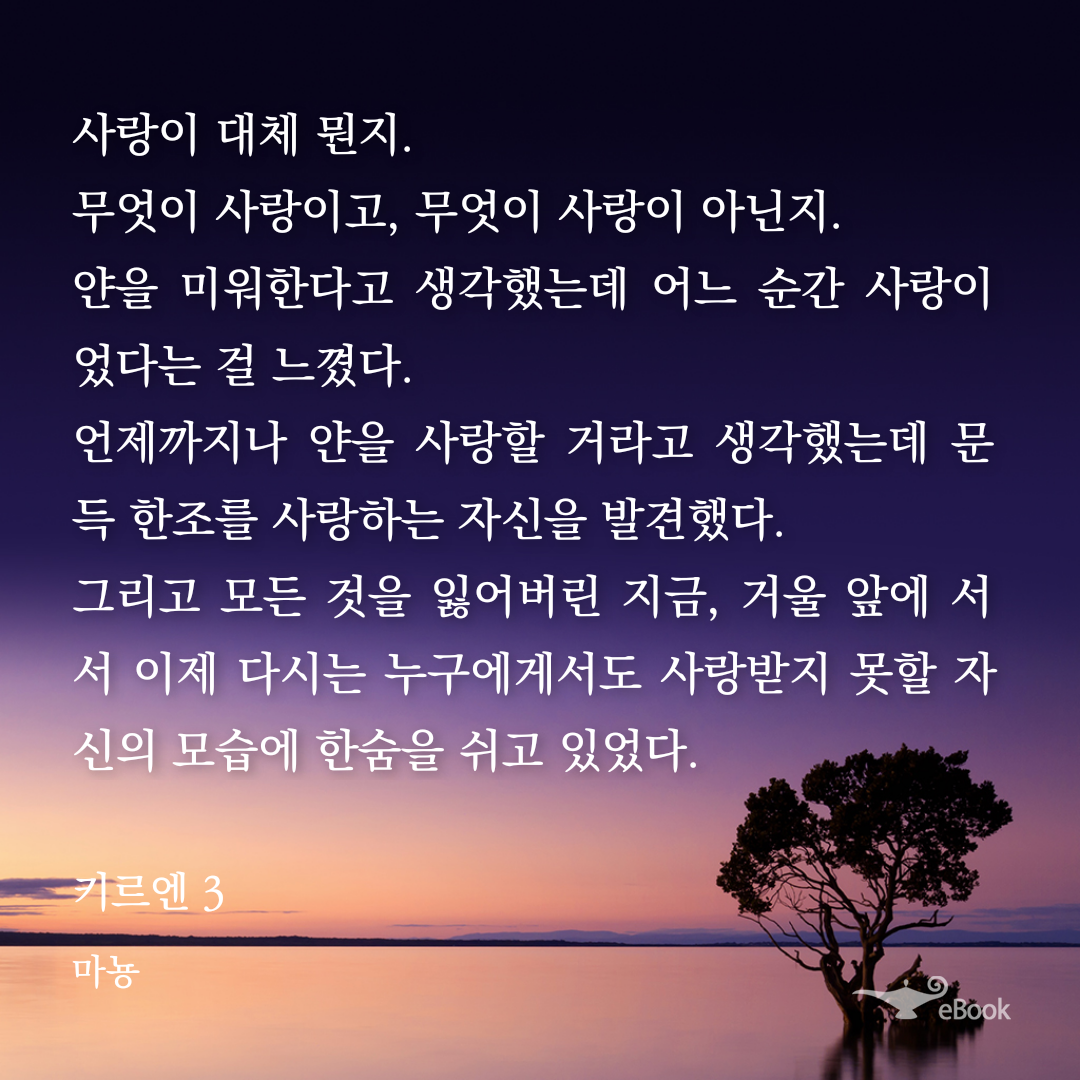 3권 중반부터 현자의 도시 생존자다운 키르엔의 홀로서기 너무 좋습니다. 3권의 '킬 하이츠'가 되기 위해 그렇게 고생을 했나 봅니다. 결국 얀이든 한조든 중요하지 않아요. 키르엔의 행복이 중요하지.