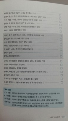 40개의 질문 중 3개 이하의 경우에만만 소금력이 충분하다는데요, 저의 경우 17개나 해당되어 전반적으로 몸의 균형이 많이 깨진 상태이고 물과 소금뿐 아니라 다른 영양분 섭취를 적극적으로 하면서 생화활습관을을 건강하게 바꾸어야 한다는 진단을 받았습니다.