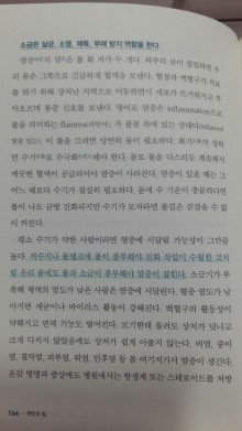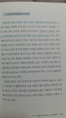 '소금으로 염증을 다스린다'입니다. 만병의 근원을 불리는 '염증', 염증의 염은 불 화 자가 두개로 외부이 균이 침입하면 우리 몸은 그쪽으로 긴급하게 혈액을 보내 혈장과 백혈구가 치료를 위해 상처난 지역으로 이동하며 세포가 뜨거워지고 부어오르며 통증 신호를 보냅니다. 이 불을 끄려면 당연히 물이 필요한데, 물로 불을 다스리듯 깨끗한 혈액이 공급되어야 염증이 사라집니다. 평소 수기가 약한 사람이라면 염증에 시달릴 가능성이 그만큼 높은데, 소금기가 부족해 체액의 염도가 낮은 사람은 염증에 시달리게 되고 또 세균이나 바이러스 활동이 강해집니다. 옛 문헌이나 최근의 연구 결과에서 소금이 염증을 제어한다는 사실들이 밝혀지고 있기에 더더욱 소금의 중요성이 와닿습니다.