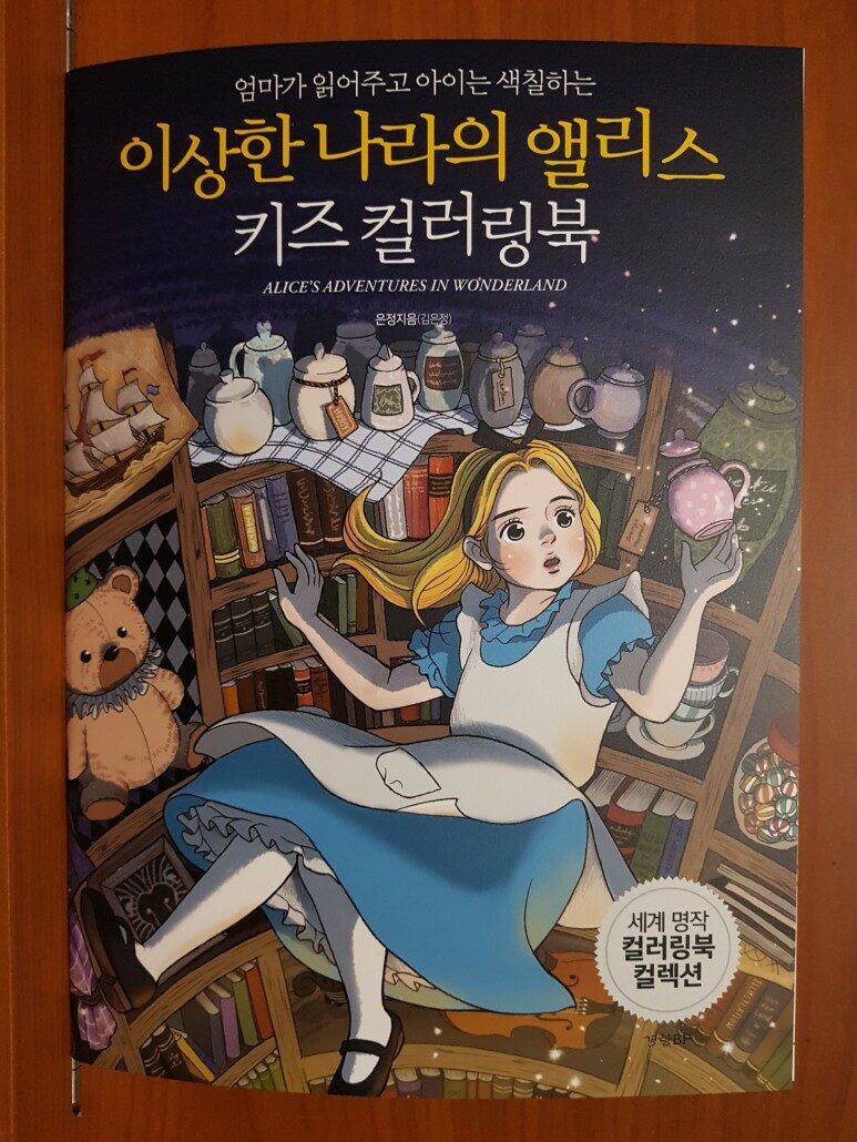 컬러링북 표지의 전형적인 앨리스의 복장은 많은 사람들이 앨리스의 옷으로 기억하고 있는데 1951년에 개봉한 월트디즈니의 애니매이션 이상한 나라의 앨리스의 캐릭터로 인해 모든 사람이 앨리스하면 떠오르는 모습인거 같아요.