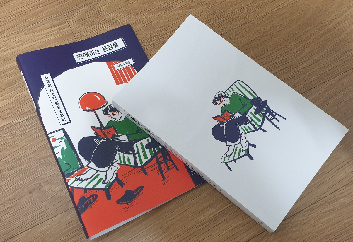’편애하는 문장들‘은 최근에 본 책들중, 받아 본 후 가장 기분이 좋아진 책이다. 신경쓴 듯 안쓴 듯 삽화가 그려진 표지와 한손에 들어오고, 겨울 외투에 들어갈만한 크기의 책, 미색의 바랜듯한 책 용지와 그위에 짙은 보라색과 붉은색으로 쓰인 글까지, 소위 요즘 인스타 감성을 책으로 출판하면 이런 느낌이지 않을까라는 생각이 드는 감각적인 도서이다. 책 판형과 모양만으로도 사람의 마음을 끈다.
