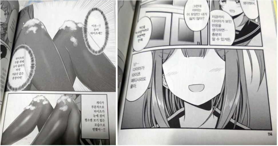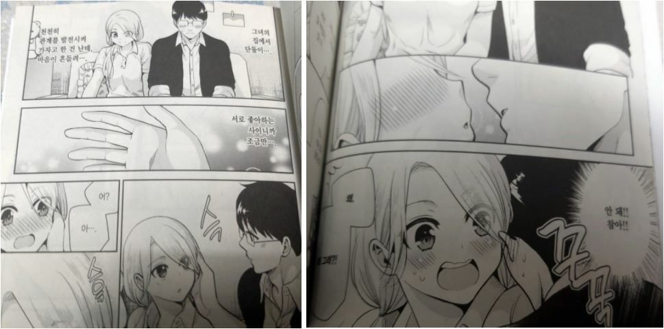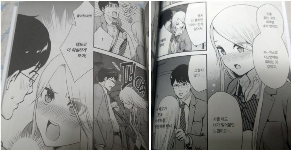 이 작품은 직장인이면서 오덕질을 하는 남자주인공과 날라리 여고생 여자주인공이 벌이는 러브코미디입니다. 아무래도 직장인은 성인이고, 여고생은 미성년자이기 때문에 법적으로나 사회적으로 조금은 우려를 표하는 부분들이 존재하기에 이런 시선들이나 선입견에 부담을 느끼지 않을까 싶었는데, 아니라 다를까 중간에 그런 분위기를 풍기는 장면이 드러내기도 하였습니다.